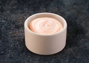 Кальмар, сухари панко, кляр темпура, соус кисло-сладкий.